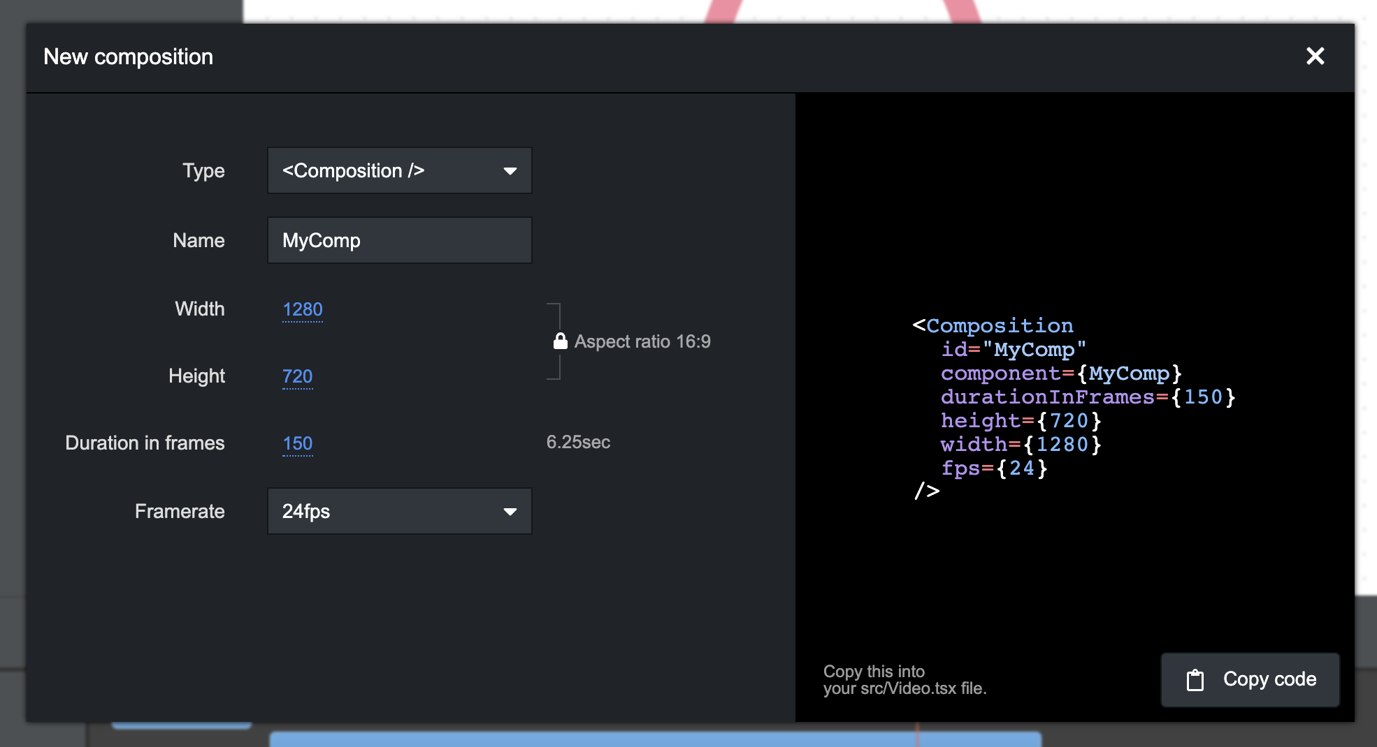 You can press N to bring up a modal that helps you generate code for creating a new <Composition /> or <Still />. Drag the sliders to quickly adjust the dimensions and duration of the video. Lock or unlock the aspect ratio. Click the numbers to enter an exact value. Receive warnings on invalid configuration. Once you are happy with the code, you can click the copy button and paste it in your src/Root.tsx file.